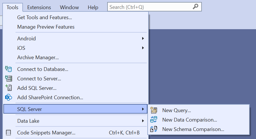 - Menu > Tools > SQL Server > Do three sub menu options exist