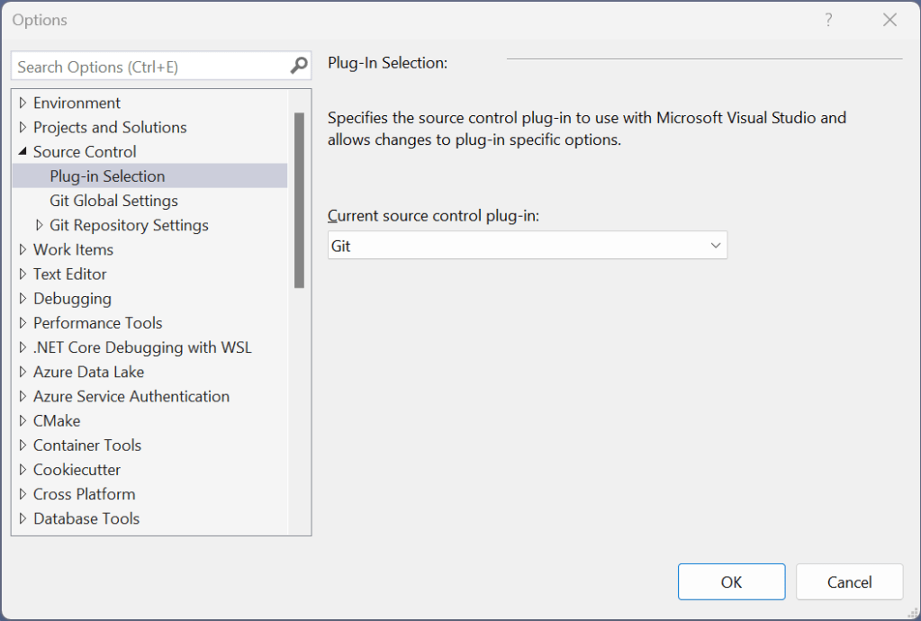 Tools > Options… > Source Control > Plug-in Selection > Current source control plug-in: Git