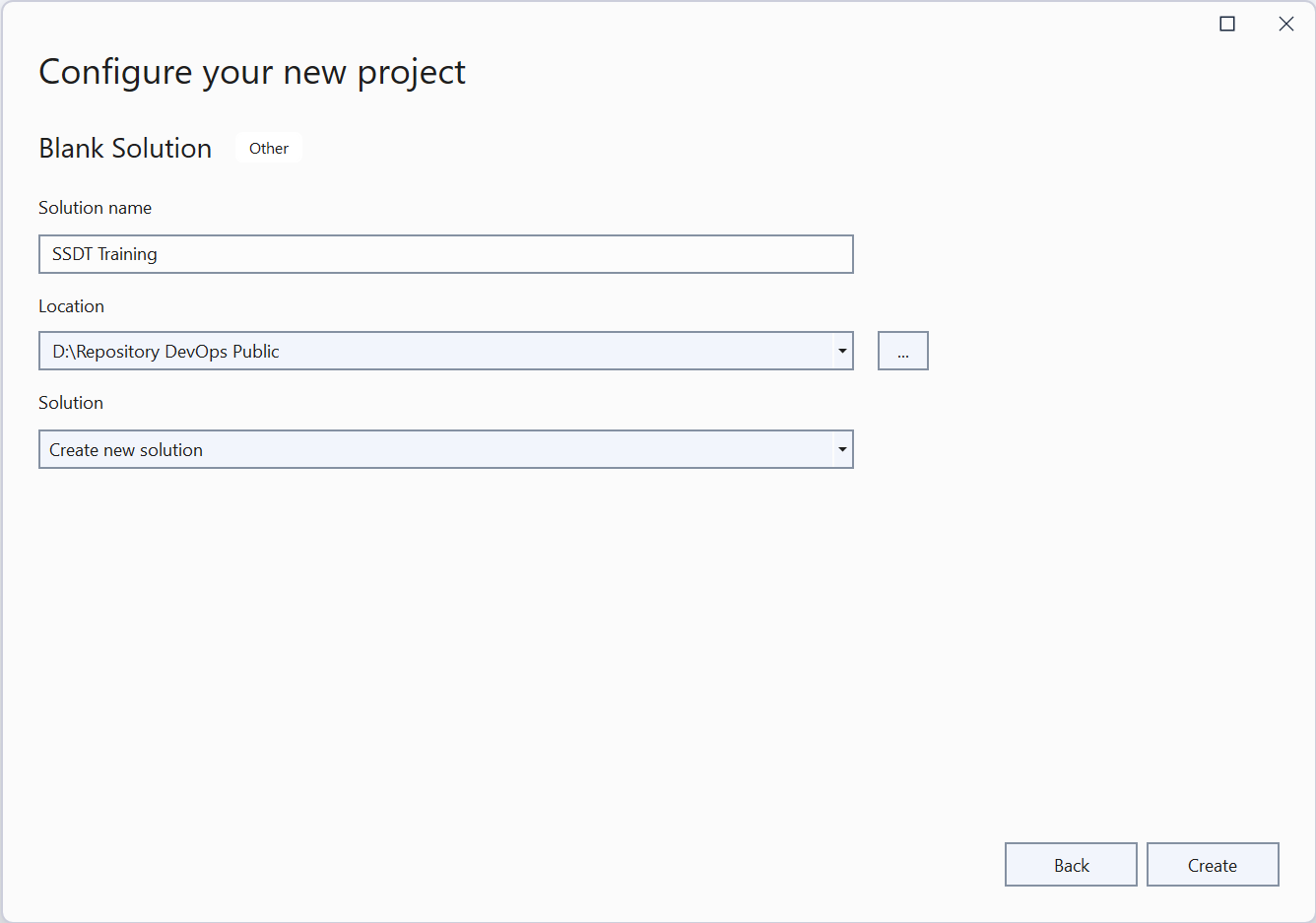 - Enter the solution name as the same as your Repository name: SSDT Training