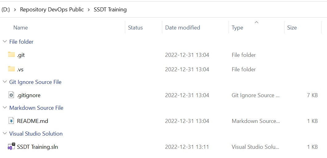 Note: SSDT Training.sln is created in the Project folder; Visual Studio nests the solution file in a folder of the same name. The initialization files, .gitignore and README.md, are still available, but do not appear in the Visual Studio Solution Folder.