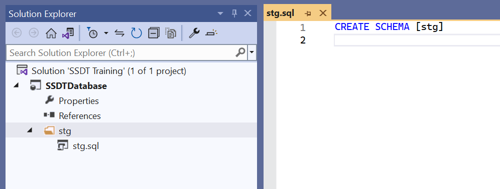 Other objects follow the same pattern of adding schemas and tables. SSDT typically uses 1 file per object.