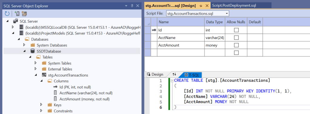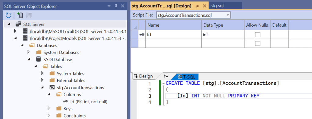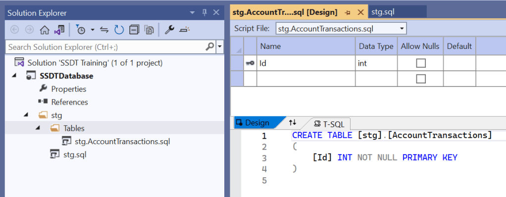 You’ll see a new file stg\Tables\stg.AccountTransactions and a new pane with a graphic table designer and T-SQL editor. Don’t add any columns just yet, we’ll do that later as we learn about debugging and publishing databases from SSDT.