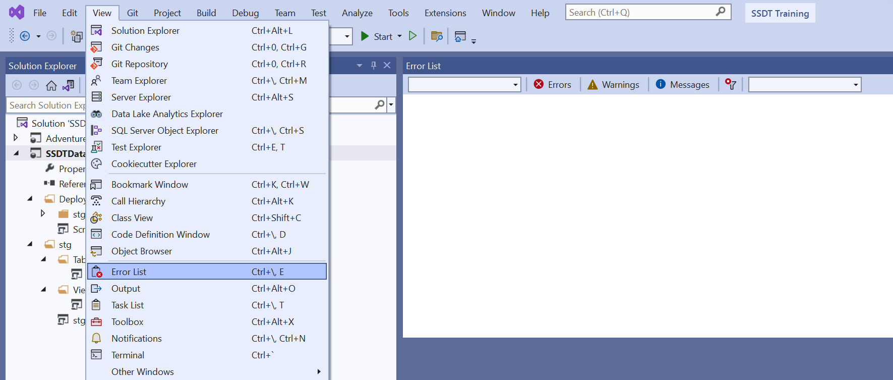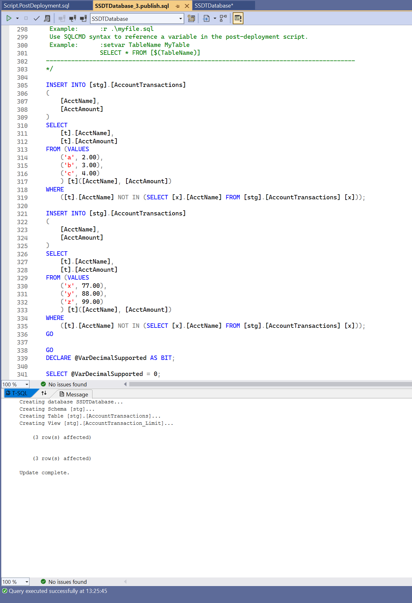 - Review the Messages (SSDT splits the code pane into T-SQL and Messages tabs) for any publish errors