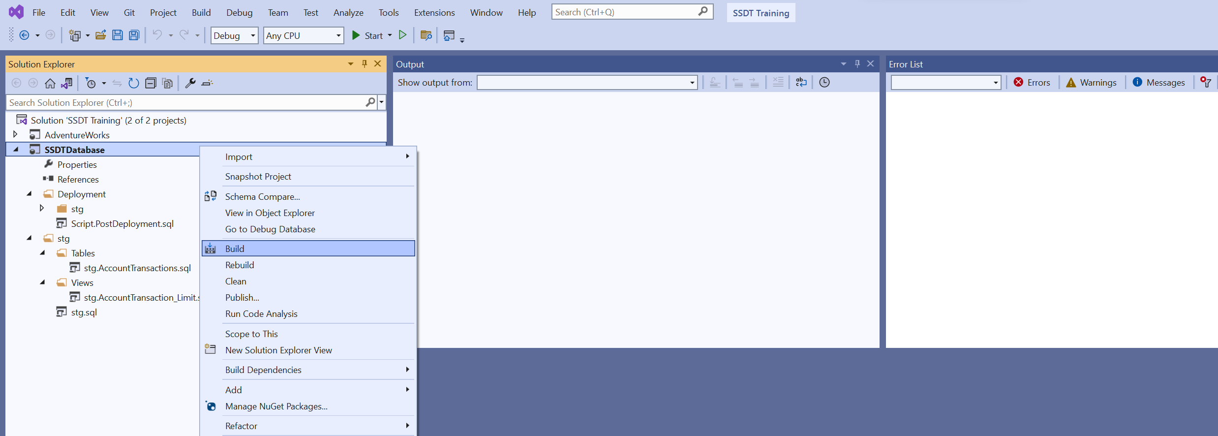 FIRST: We’re using SSDTDatabase Project and we introduced an error in an earlier post; resolve this error, delete or use the correct column name in the view, to continue.