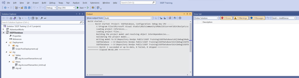 Now we’ll build the database, review the output, and also recheck the Error List: