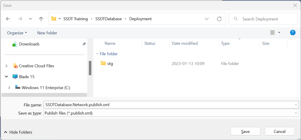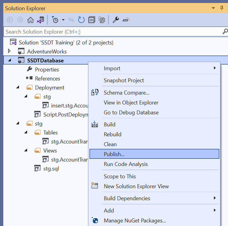 - It should be nested under the Solution (SSDT Training) > Project (SSDTDatabase) > Folder (Deployment)