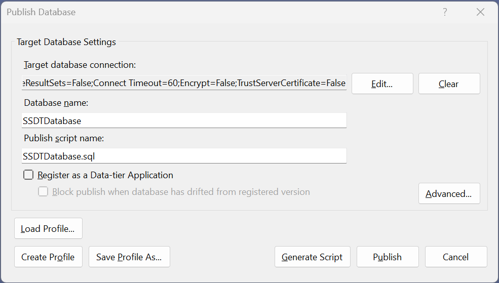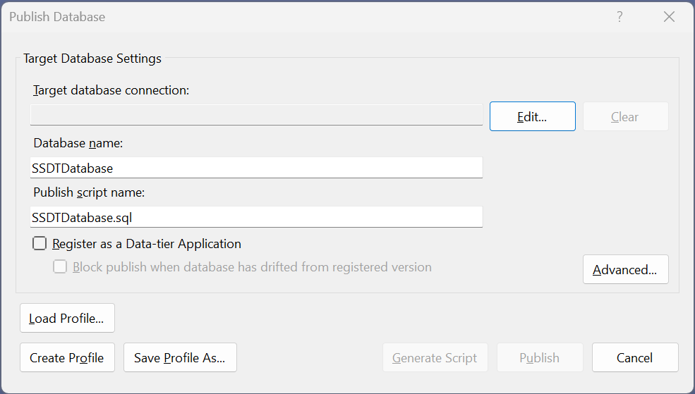 - Since the project name (SSDTDatabase) is the default, we will use it for the Database name