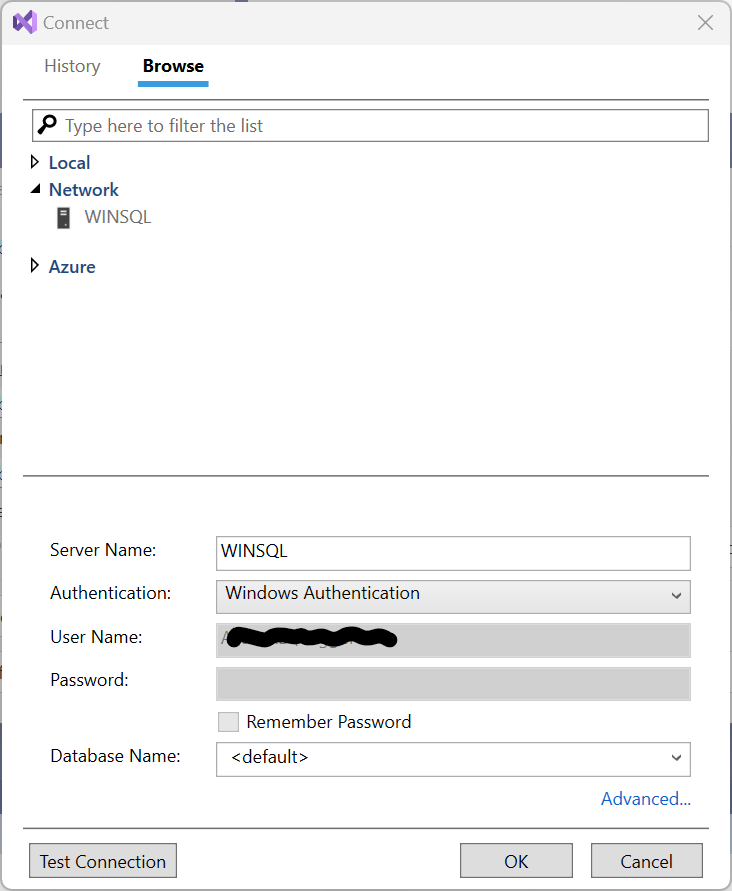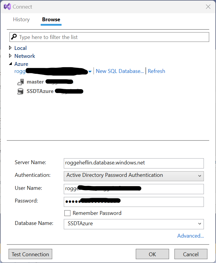 - Select a different SQL Server, I’m selecting an empty database in Azure