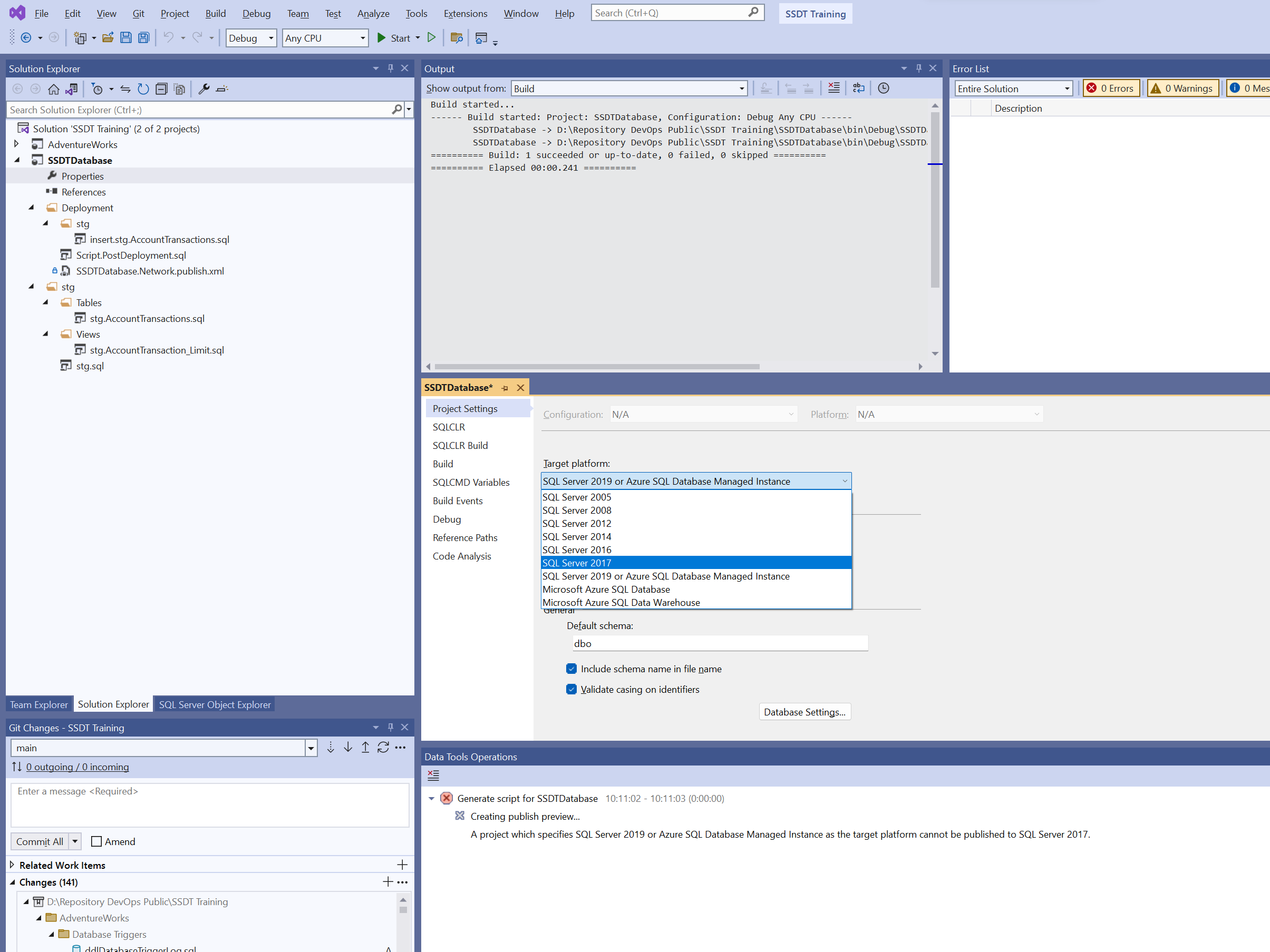 - Set the Project Properties > Project Settings > Target Platform to your SQL Server instance
