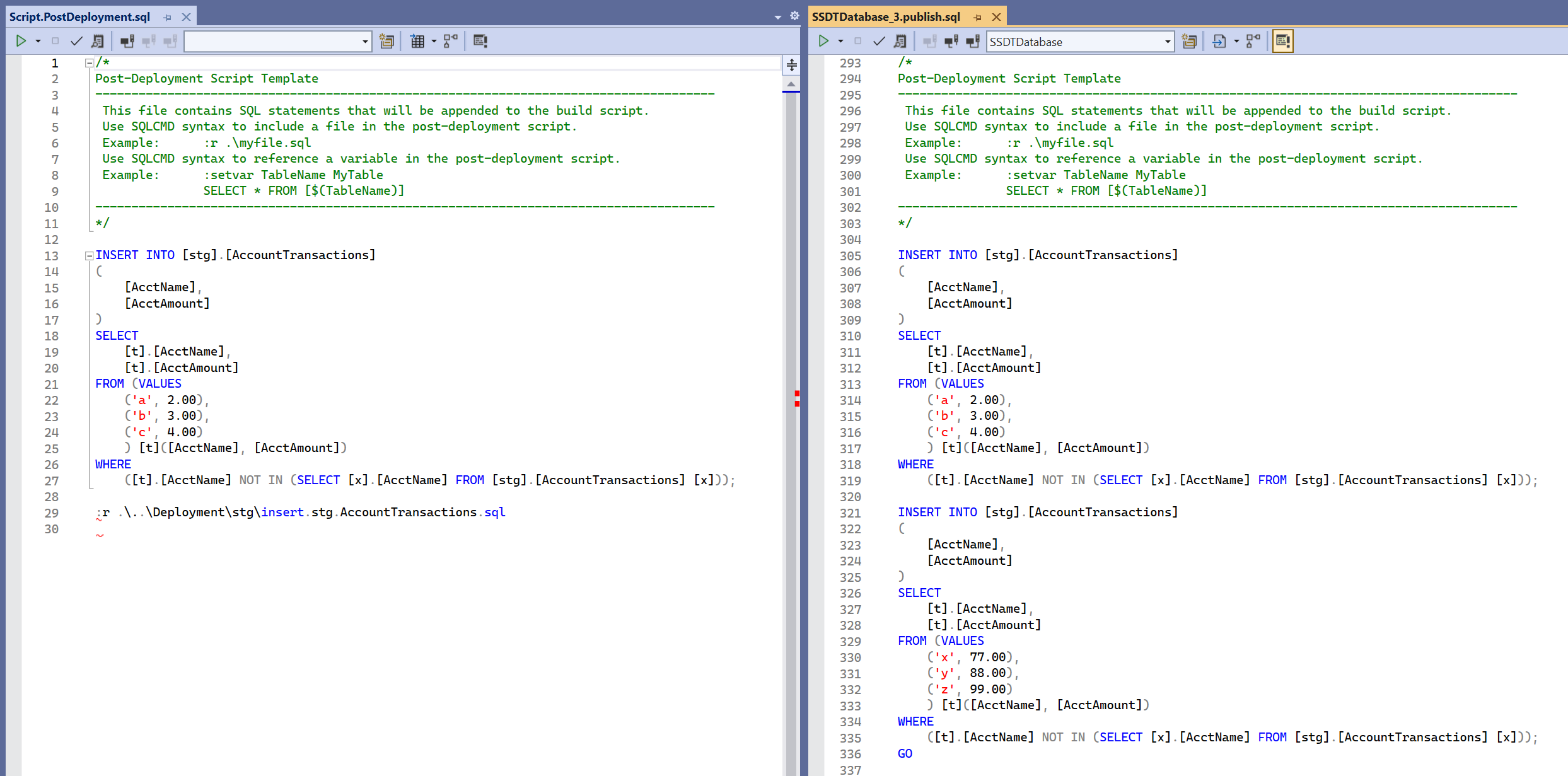 When writing Script.PostDeployment.sql, we included a line beginning with :r; the deployment script did not contain that line; SSDT replaced the line with the code from the referenced file: