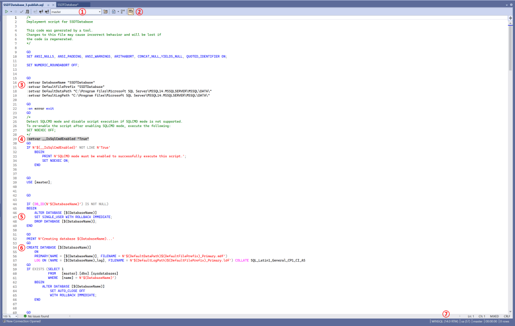 ② SQLCMD mode – The script must be run in SQLCMD mode